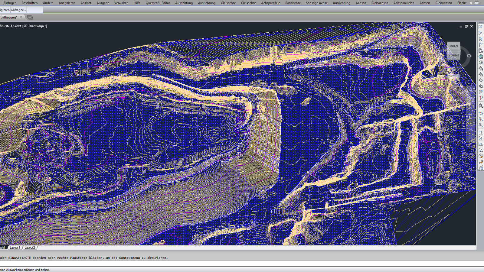 Finale Darstellung der Ergebnisse (hier: Isohypsen) der virtuellen Vermessung in AutoCAD.